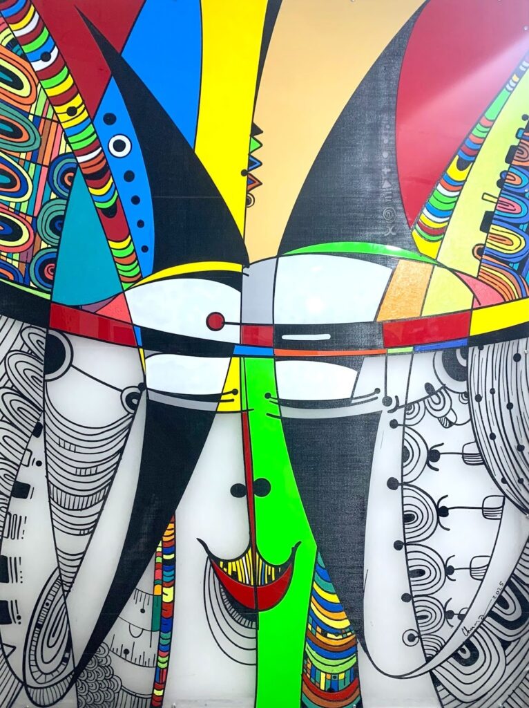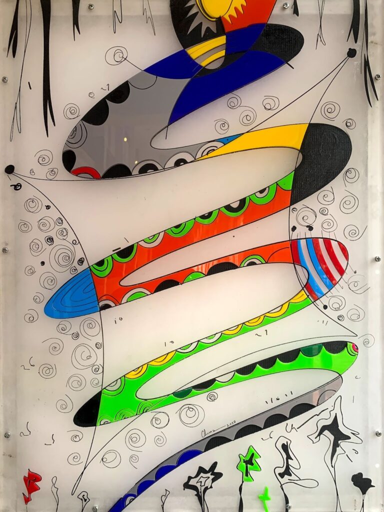 Red Line is notable for Chuma’s stellar use of plexiglass to denote visual representations of concepts from nsibidi, Igbo culture, and spirituality. The pieces share a common characteristic of reds, yellows, and greens bursting from an abstract, plain space. All but two of the pieces are named in Igbo: Mbetocracy and Sit at Home. Mbetocracy is a clever use of the word Mbe, the Igbo word for tortoise, which are central characters in the artwork.