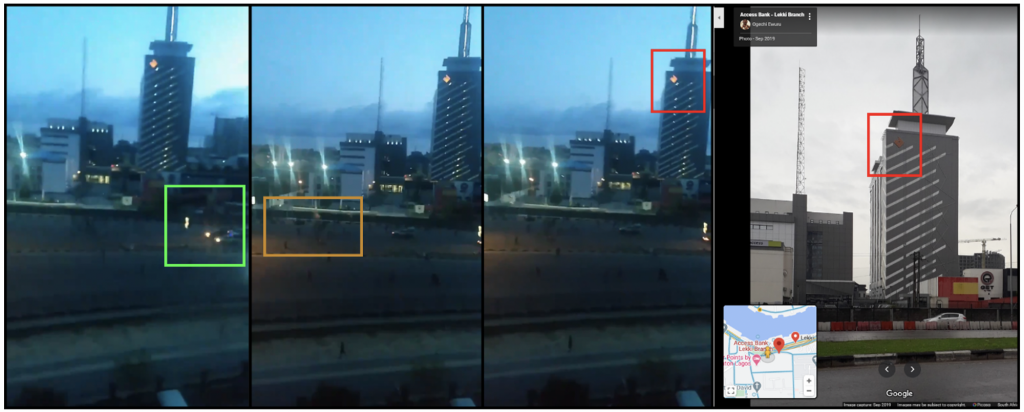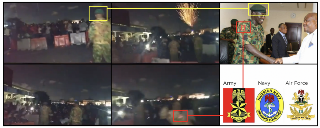 A different video shows what appears to be soldiers of the Nigerian army approaching protesters where they were stationed behind plastic barriers. Soldiers approached the group and opened fire. No warning is heard in the video. Muzzle flashes indicate that several of the shots seen and heard here were fired into the air. It confirmed using features close to the toll-gate and across the channel that the video was taken “looking into a northern direction on the eastern part of the toll gate, suggesting that protesters were approached from both the east and west by law enforcement, as suggested by some witnesses.