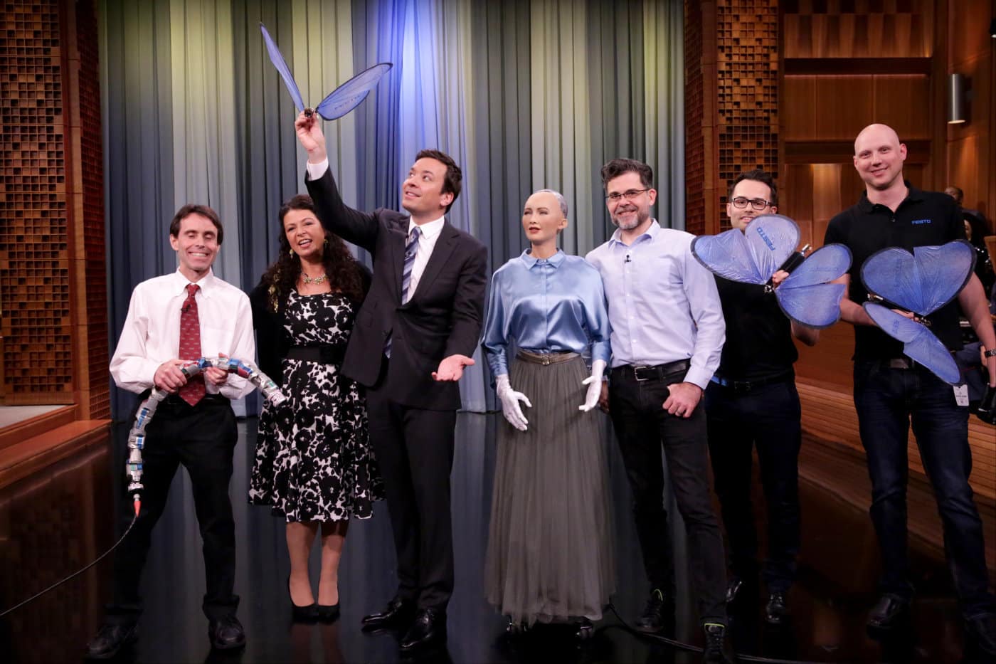 ‘Sophia defies conventional thinking of what a robot should look like. Designed to look like Audrey Hepburn, Sophia embodies Hepburn’s classic beauty: porcelain skin, a slender nose, high cheekbones, an intriguing smile, and deeply expressive eyes that seem to change color with the light. If ever there were a robot with a simple elegance people can’t help but appreciate, it would be Sophia.’ – Hanson.