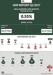 Yesterday, the nation was greeted with great news. The National Bureau of Statistics announced that the Nigerian economy has recorded a growth of 0.55% in this quarter and pulled out of its recession. After recording decline in growth in five consecutive quarters, leading to the nation’s first economic recession in two decades. The economy experienced the negative effects of bad policies, inadequate planning, and incompetence in the second half of 2016.